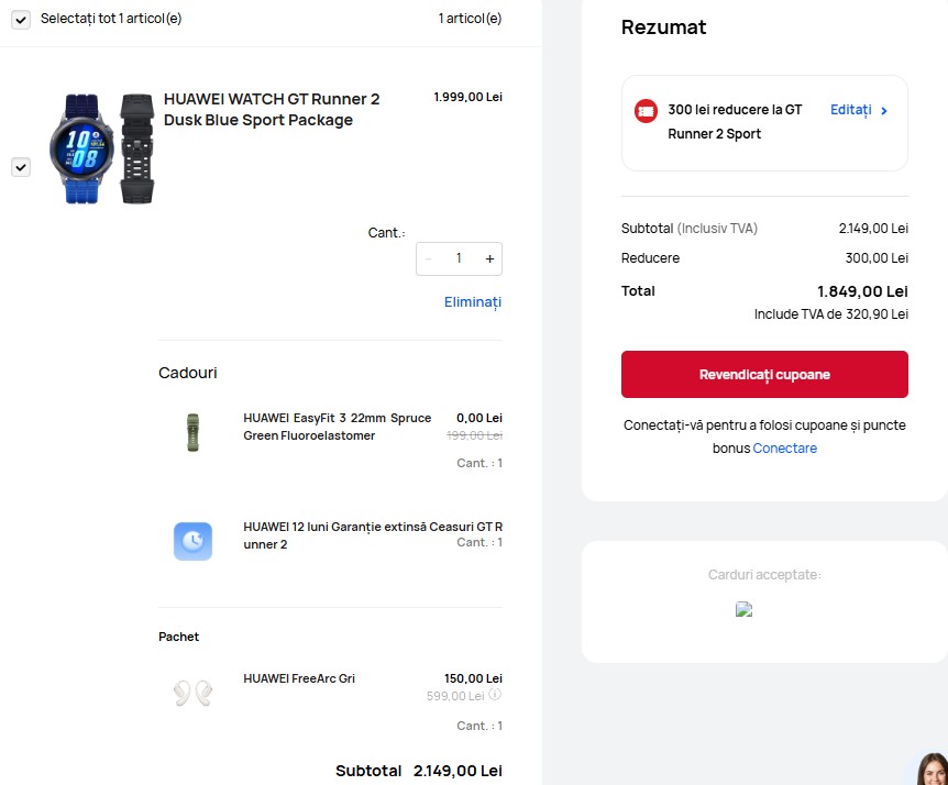 Prețul inițial al pachetului este de 2.149 lei, însă cu ajutorul codului promoțional „A300RUNNER2”, acesta scade la doar 1.849 lei. În ofertă sunt incluse și căștile Huawei FreeArc, un model sport foarte bine cotat, care în mod normal se vinde separat la un preț mai ridicat, dar aici poate fi achiziționat practic la un cost simbolic. Raportul calitate-preț devine astfel extrem de atractiv, mai ales pentru cei interesați de wearables. Ceasul a fost testat de noi și documentat în acest review.