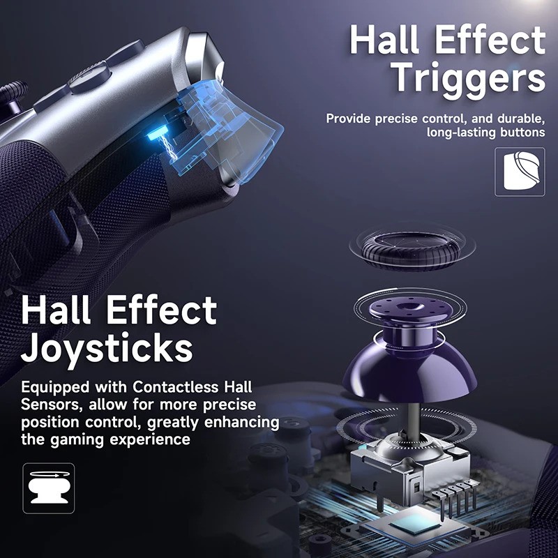 Are butoane complet metalice, compatibilitate multi platformă și aduce triggere analog cu Hall Effect 3D, pentru control mai precis și reducerea efectului de drift în jocuri. Are și o baterie de 1000 mAh cu autonomie de până la 30 de ore, vine cu 2 butoane programabile în spate iar din aplicație se pot customiza butoanele B, X, Y, LB, RB, LT, RT, D-Pad, LSB și RSB după bunul plac (asta pe Android).