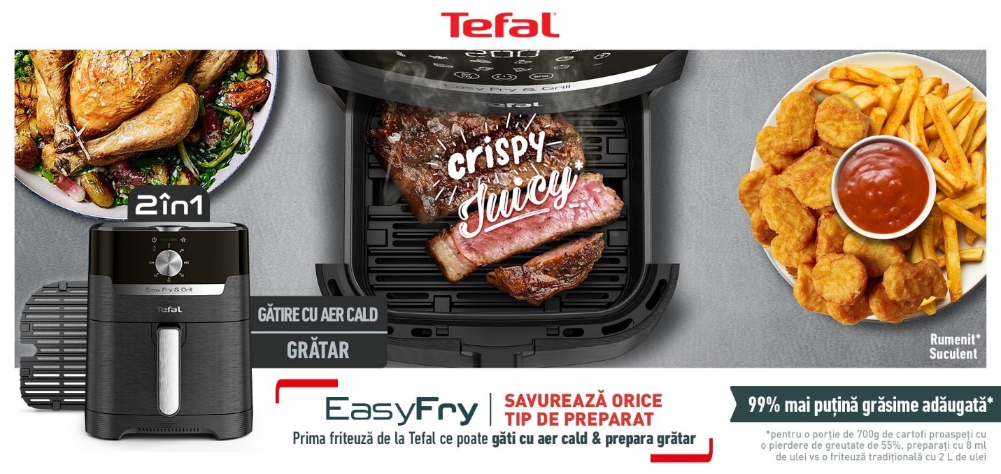 Acest aparat combină beneficiile unei friteuze cu aer cald cu cele ale unui grătar pentru ca tu să poți prepara rețete delicoase cu o cantitate foarte mică de ulei. Are funcție de timer, se curăță ușor, iar prin intermediul său poți prepara cartofi prăjiți, carne de pui / vită / porc, pește, legume, chiar și prăjituri. Observ că are peste 120 de recenzii, iar 97% din clienți recomandă produsul. Poți comanda friteuza Tefal Easy Fry & Grill de aici!