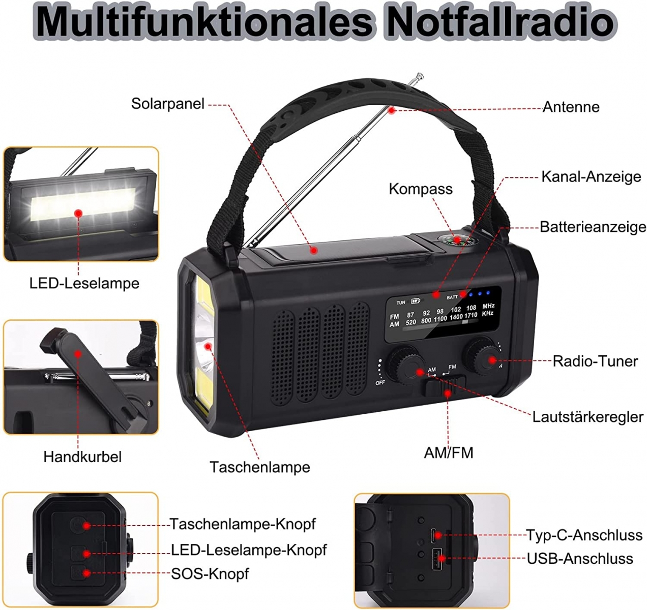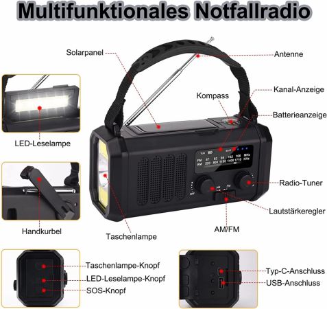 Produsul e promovat drept „Radio cu alimentare solară” și include o baterie de 10.000 mAh, folosită și pentru încărcarea smartphone-ului prin cablu USB în situații de urgență. Cântărește aproximativ 550 de grame, aduce un corp robust, iar în partea superioară există o lampă orientată în jos, pentru citit. Lateral găsim o altă lampă LED cu funcție de lanternă. Gadget-ul vine cu mâner pentru transport, iar radioul poate fi controlat prin intermediul butoanelor aflate în partea din față.
