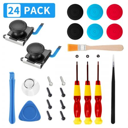 Acest set cuprinde două thumbstick-uri, 6 căpăcele colorate pentru acestea, șuruburi pentru fixare și evident, șurubelnițe și accesorii pentru demontarea controller-ului cu probleme. Conform producătorului și a recenziilor, odată înlocuite thumbstick-urile controller-ului tău, acestea nu mai manifestă problema stick-drift.