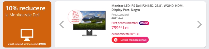 Puteți găsi și monitoare Dell cu 10% mai ieftine dacă aveți abonament eMAG Genius. Modelul Dell P2418D cu diagonală de 23.8 inch, rezoluție WQHD și panou LED costă astfel doar 799 lei. Vine cu 5x porturi USB 3.0, 1x HDMI și 1x Display Port iar timpul de răspuns este de 8ms, fiind un monitor pentru Home & Office.