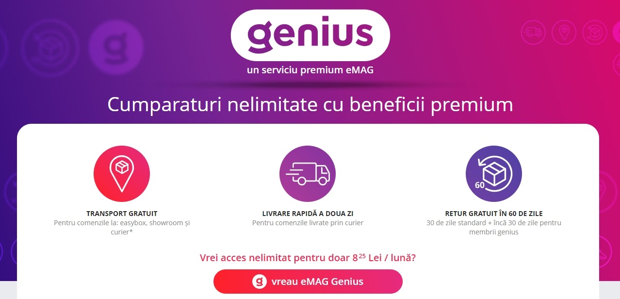 Până pe 8 aprilie Genius Days vine cu oferte exclusive, pe lângă beneficiile premium clasice. eMAG genius este un abonament lunar, care aduce beneficii precum transport gratuit la Easybox, retur gratuit în 60 de zile în loc de 30, livrare mai rapidă, transport gratuit prin curier (100 lei comanda minimă) şi retur la Easybox. Sunt şi extra beneficii, precum livrare gratuită în aplicaţia Tazz pentru comenzile la restaurante peste 75 de lei, dar şi 10% extra discount la Fashion.
