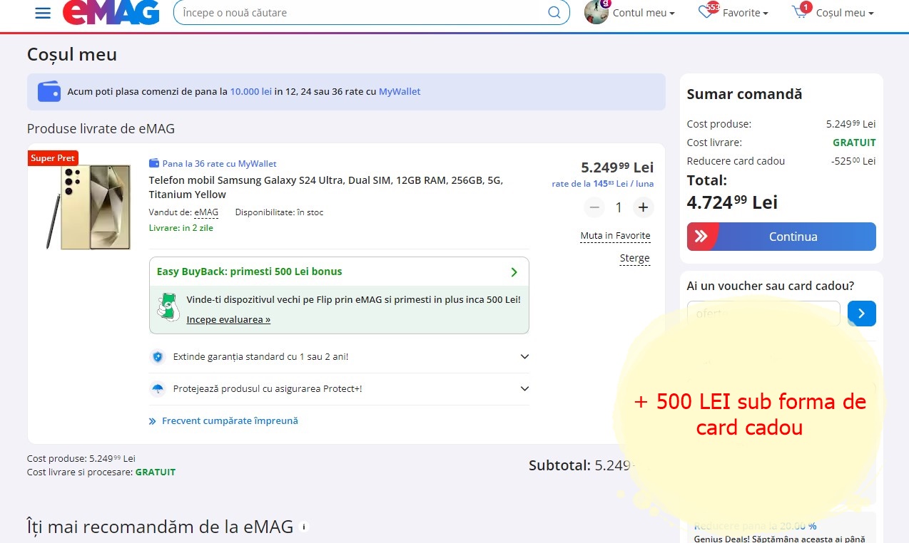 UPDATE: Pare că s-a vândut bine Galaxy S24 Ultra în dimineața zilei de sâmbătă. A rămas în stoc varianta „Yellow” la 5249 lei. Folosind codul „oferte” primești 10% extra-discount din această sumă, iar la achiziție ai un card cadou în valoare de 500 lei. Asta duce prețul final undeva la 4224 lei.