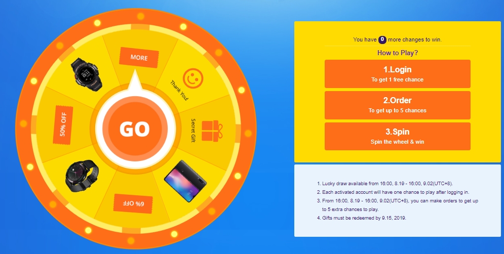 Mai este și zona "Top Picks" unde găsiți trotineta Kugoo S1 la 288.47 euro sau telefonul Redmi Note 7 pentru 160.46 euro. Pentru că am vorbit și despre concurs, aflați că puteți câștiga un Xiaomi Mi 9 sau chiar 20% din suma cheltuită pe site înapoi la o tombolă specială sub formă de roata norocului. Doar învârtiți roata și aflați ce premiu ați câștigat!