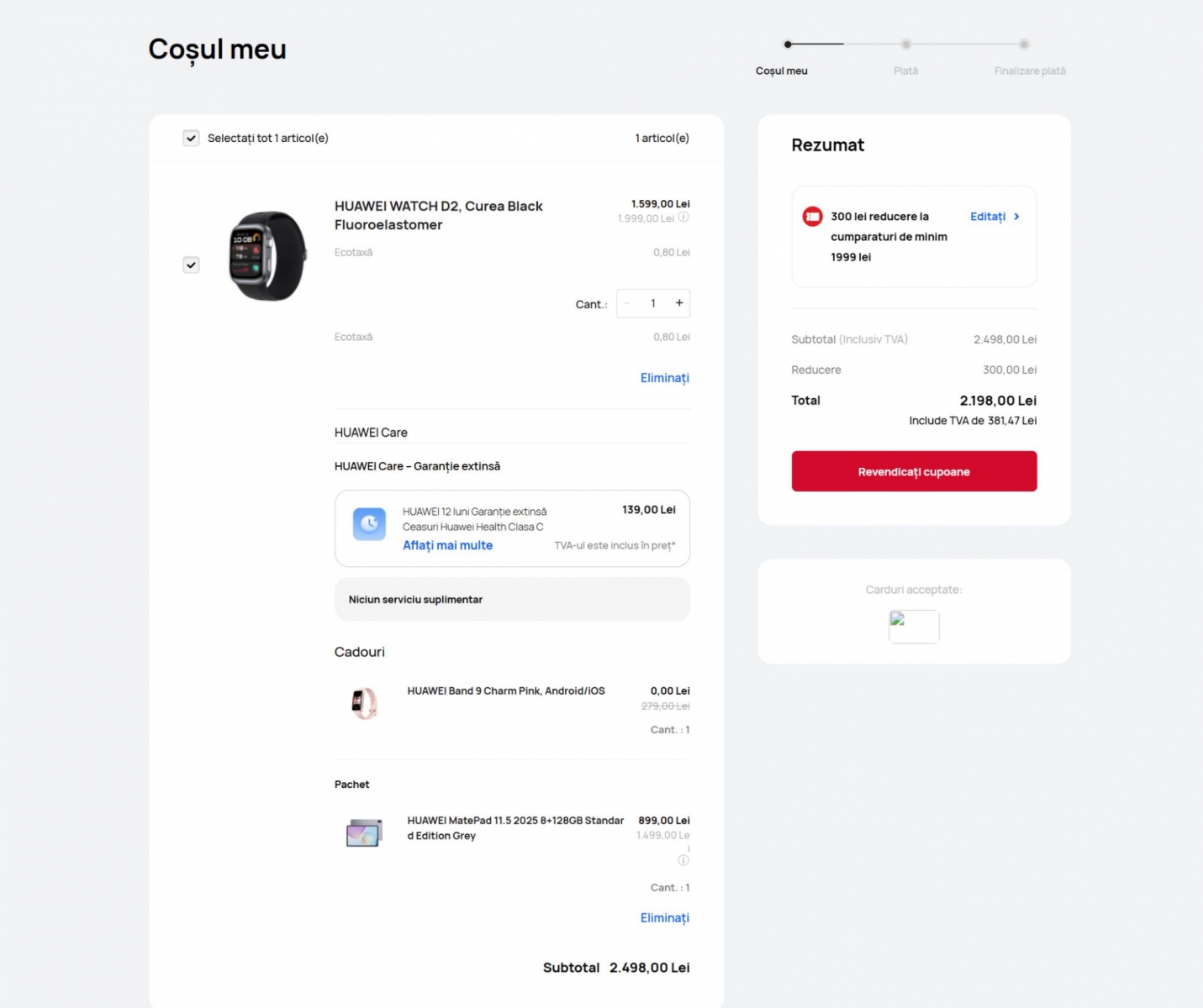 Apoi, dacă alegi un Huawei Watch D2, ceas cu tensiometru, el costă acum 1599 lei faţă de clasicul 1999 lei. Apoi ai ofertă la tableta Huawei MatePad 11.5 2025, dacă o cumperi împreună cu acest ceas. Preţul său ajunge la 899 lei. La final la checkout ai 2498 lei, doar că surpriză!! aplici voucherul de 300 de lei şi ai de fapt 2198 lei.