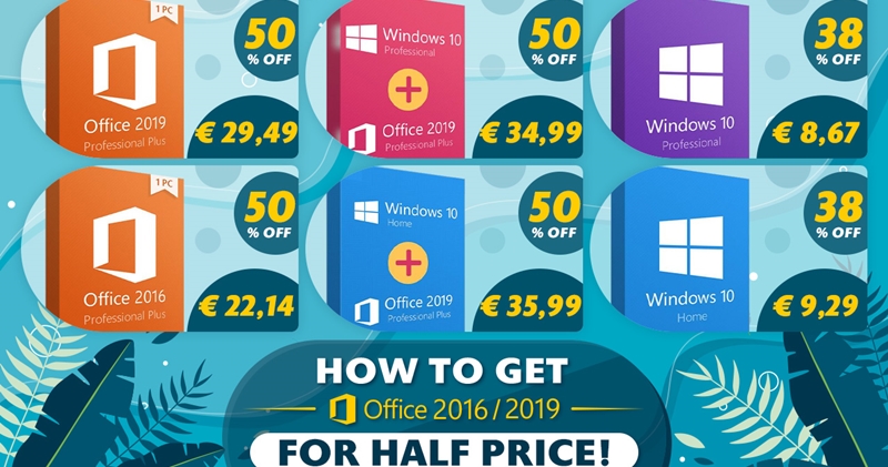 - Windows 10 Home + Office 2019 Pro: 35.99 eur