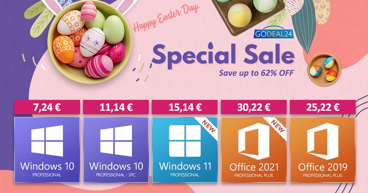 Începutul lunii aprilie ne aduce reduceri speciale din partea retailerilor și nu vorbim neapărat doar despre produse hardware, ci și despre soluțiile software. Astăzi, de exemplu, descoperim că cei de la GoDeal24.com ne-au pregătit o campanie specială de Paște în care discount-urile ajung chiar până la 62%. Sunt vizate licențele software, pe listă fiind Windows 10/Home/Pro, soluțiile Office, cât și bundle-urile ce combină cele mai populare produse Microsoft.