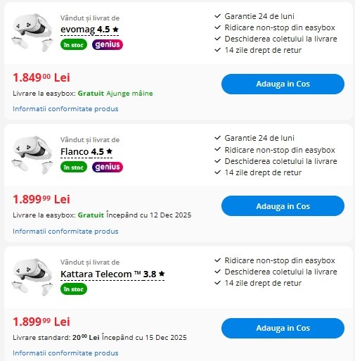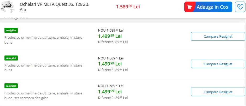 Am urmărit prețurile la Meta Quest 3S, iar la alți retaileri varianta nouă pornește de la 1.899 lei și ajunge chiar aproape de 2.000 lei, conform Compari.ro. Chiar și pe eMAG există mai multe oferte pentru aceeași versiune, de la diferiți vânzători, însă toate au prețuri semnificativ mai ridicate decât cel oficial. În acest context, resigilatul eMAG este în mod clar cea mai ieftină variantă disponibilă în prezent, sub prețul oricărei oferte standard.