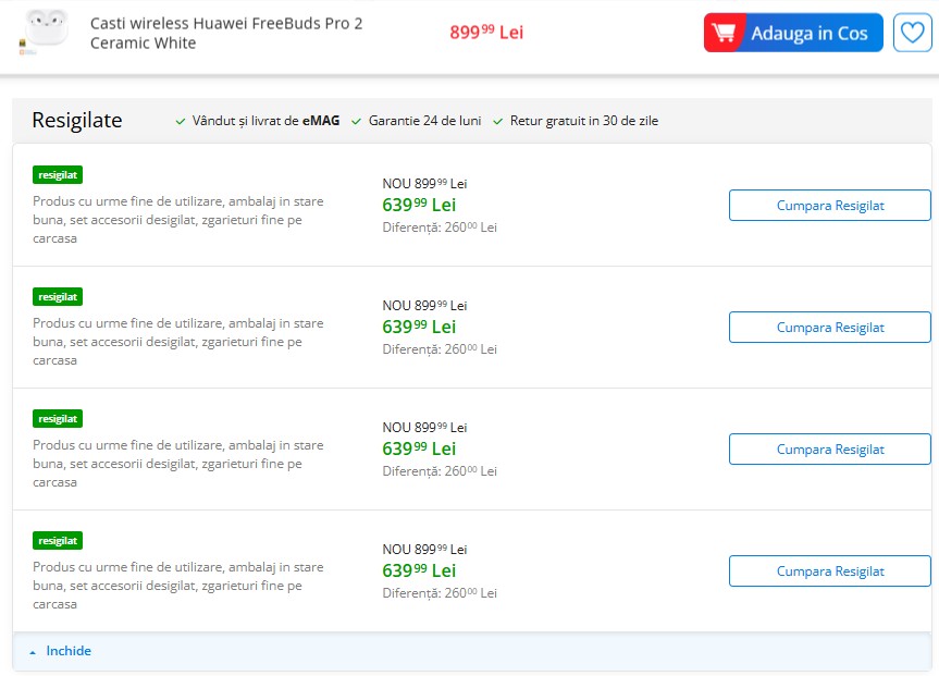 Huawei FreeBuds Pro 2 Ceramic White pot fi cumpărate resigilate la eMAG pentru 639 lei, cu 260 lei mai puțin decât varianta nouă. Produsul prezintă urme fine de utilizare, ambalaj în stare bună și accesorii desigilate. Aceeași calitate a sunetului, la un preț mai mic!