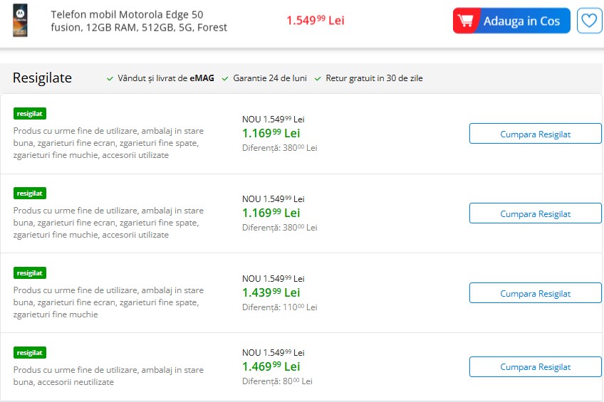 Pe eMAG, varianta nouă e 1.549 lei. Dar dacă nu te deranjează ambalajul un pic șifonat sau niște urme fine de utilizare (cum ar fi niște micro-zgârieturi), poți să-l iei resigilat cu doar 1.169 lei. Ai o economie de 380 lei pe loc – banii ăia îi poți investi într-o husă cool, căști wireless sau... o ieșire cu prietenii, zic și eu.