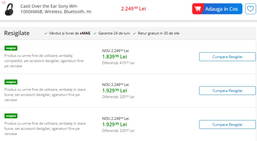 Sony WH-1000XM6B, nou, costă 2.249 lei pe eMAG. Dar dacă vrei să faci o alegere deșteaptă, poți merge pe varianta resigilată, care începe de la 1.839 lei – în funcție de starea ambalajului sau eventualele urme fine de utilizare.
