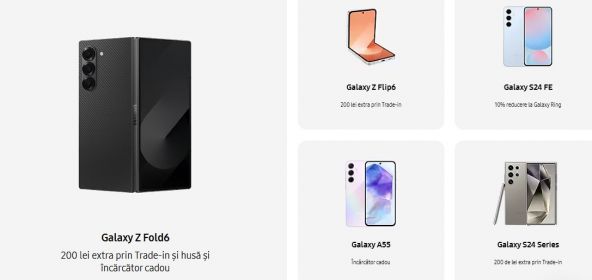 În categoria smartphone-uri, Galaxy S24 Ultra vine la prețul de 5.899,90 lei, cu 200 lei extra prin programul Trade-In și accesorii cadou, precum încărcătorul. Dacă preferi modelele pliabile, Galaxy Z Fold6 și Z Flip6 oferă aceleași beneficii, inclusiv husă și încărcător, pentru un upgrade complet. Galaxy Z Flip6 se găsește la preț de 5.999 lei, iar Z Fold6 la 9.999 lei.