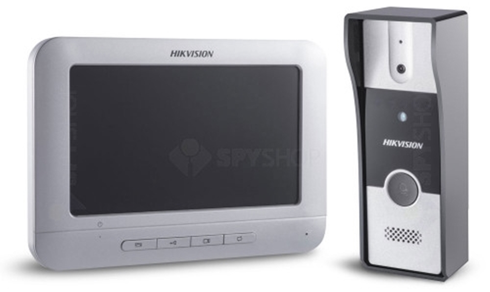O altă firmă “grea”, cunoscută la nivel internațional este Hikvision. Este un set format dintr-un post interior și unul interior cu monitor de 7 inch și handsfree. Avem incluse aici și 4 butoane fizice prin care poate fi controlat. El oferă microfon omnidirecțional, control acces, asigură o montare ușoară și permite atașarea a trei camere analogice. Senzorul CMOS integrat aici măsoară 1/4 inch, oferă rezoluție video de 720 x 572 pixeli, iar viteza de redare este de 25 FPS. Acest kit costă 294 lei și poate fi comandat de aici!