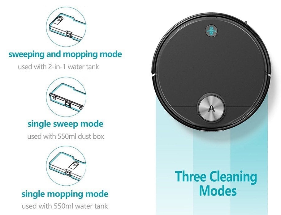Aflați că acest aspirator intitulat Xiaomi Viomi V3 se remarcă prin 3 moduri de curățare. Avem în primul rând modul de aspirare uscată care folosește rezervorul de praf de 550ml, modul de curățare mop care folosește același rezervor de 550ml dar pentru colectarea apei murdare. Nu în ultimul rând există și modul 2 în 1 prin care se combină aspirarea uscată cu cea umedă pentru o curățenie eficientă.