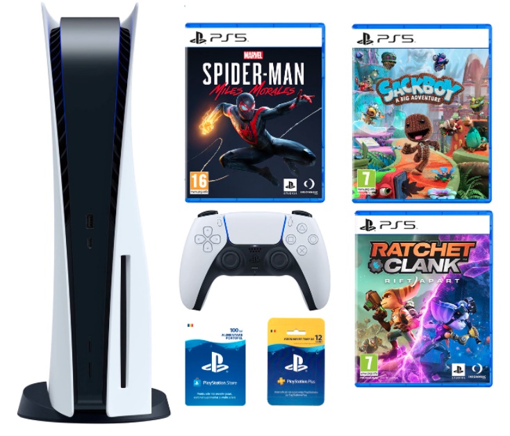 OFERTĂ FLANCO: PlayStation 5 + Spider Man Miles Morales + Demon's Souls + Ratchet and Clank + PS Plus 90 zile + card PS Store 250 lei = 3899,99 lei