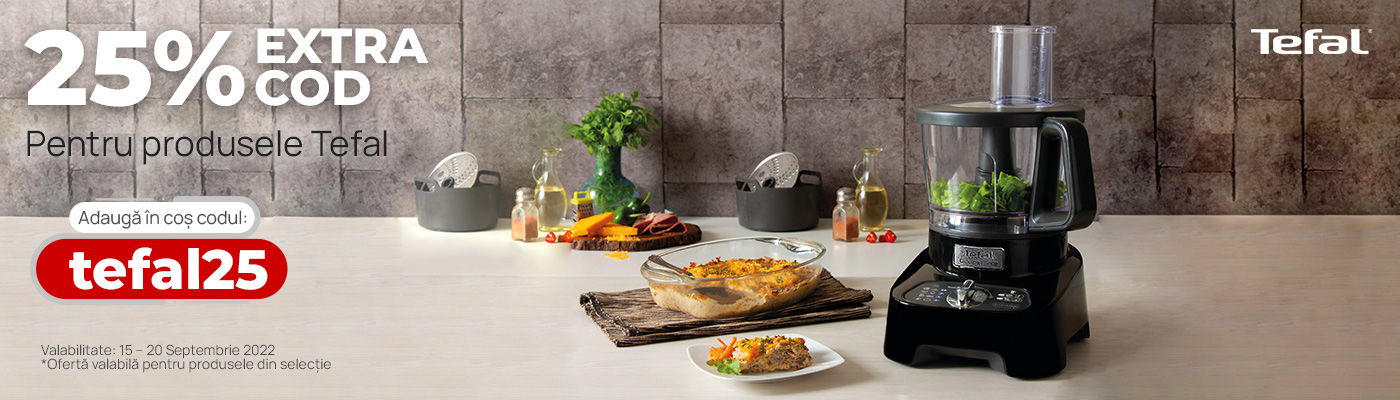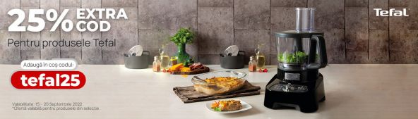 Dacă vreţi un produs de la Tefal cumpărat de la evoMAG cu reducere, trebuie doar să îl puneţi în coş şi să aplicaţi codul "tefal25", pentru o reducere de 25%. Iată ce produse au reduceri: