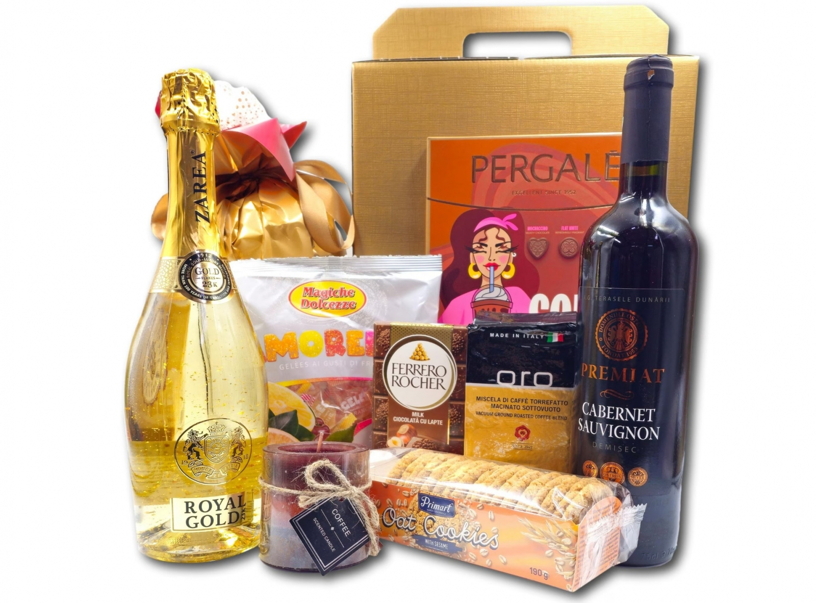 - Pachet cadou de sărbătoare, CADOURI PREMIUM®, model Sparkling Joys, cu spumant Zărea Royal Gold infuzat cu aur 23k, vin roşu Premiat, cafea italiană, surprize dulci şi accesorii pentru momente speciale: 199 lei