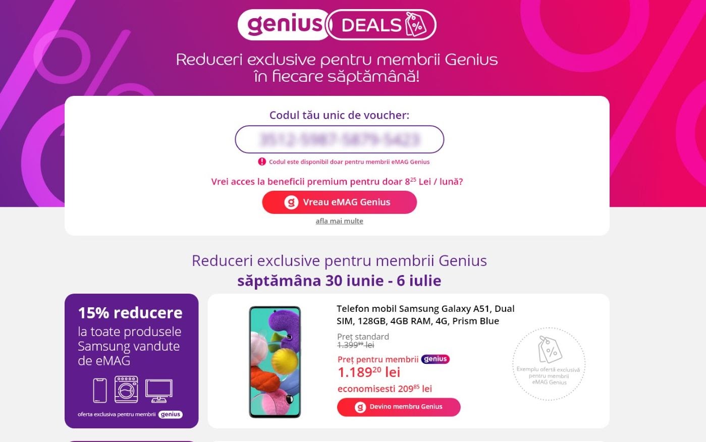 Cum vă sună un Samsung Galaxy A51 la mai puţin de 1200 lei? Aşa cum ne aşteptam, eMAG a început să implementeze oferte speciale şi reduceri pentru cei care au abonament Genius. Costă doar 8.25 lei pe lună şi vă oferă livrare gratuită. Cine are acel abonament poate cumpăra un Galaxy A51 la suma de mai sus, dar are şi reduceri la staţii de călcat Tefal, apă de toaletă Paco Rabanne şi încălţăminte Polo Ralph Lauren. Găsiţi aici toate ofertele.