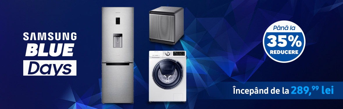 În această perioadă evoMAG are reduceri de până la 35% pentru electrocasnicele Samsung în cadrul Samsung Blue Days. Se aplică la maşini de spălat rufe, maşini de spălat vase, purificatoare de aer, aspiratoare, hote, cuptoare electrice şi multe altele. Ofertele sunt aici.