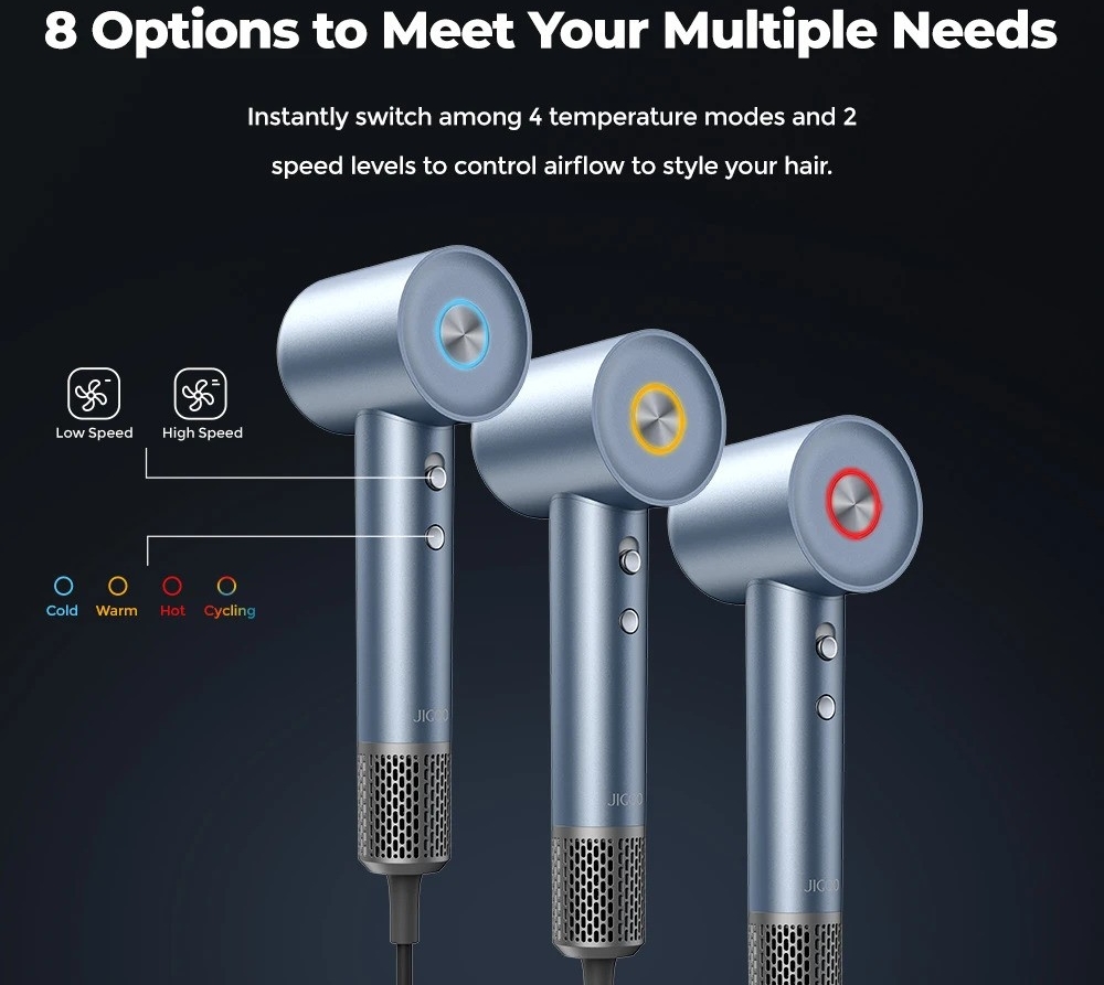 În primul rând descoperim că în comparația cu uscătoarele de păr tradiționale, JIGOO H300 folosește un motor brushless 110.000 RPM care livrează astfel un flux puternic de aer de 22m/s pentru o uscare mult mai rapidă. Acesta poate usca părul și la temperaturi mici, prevenind deteriorarea părului.