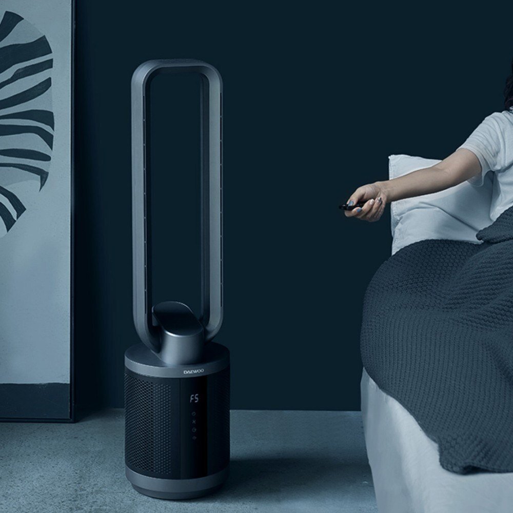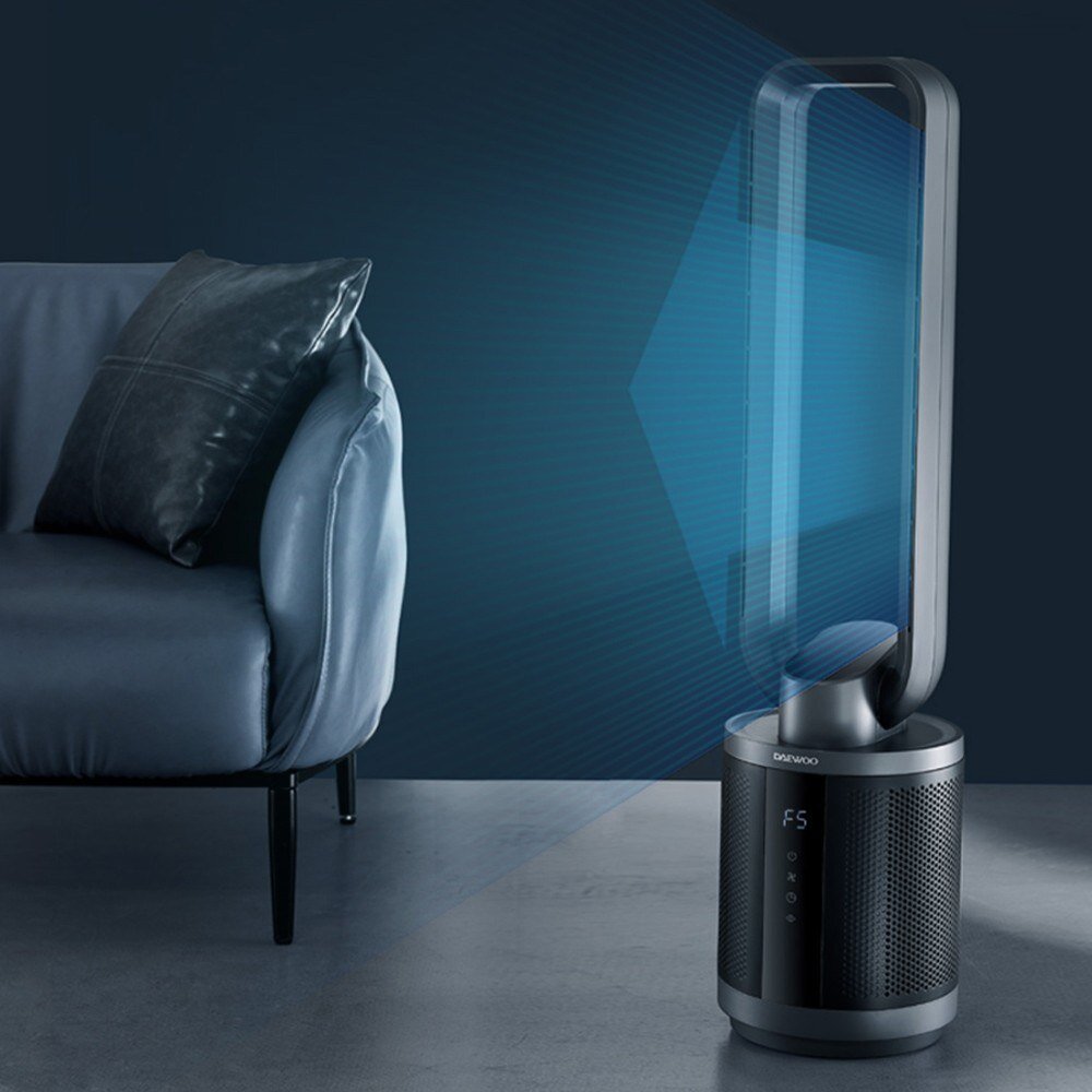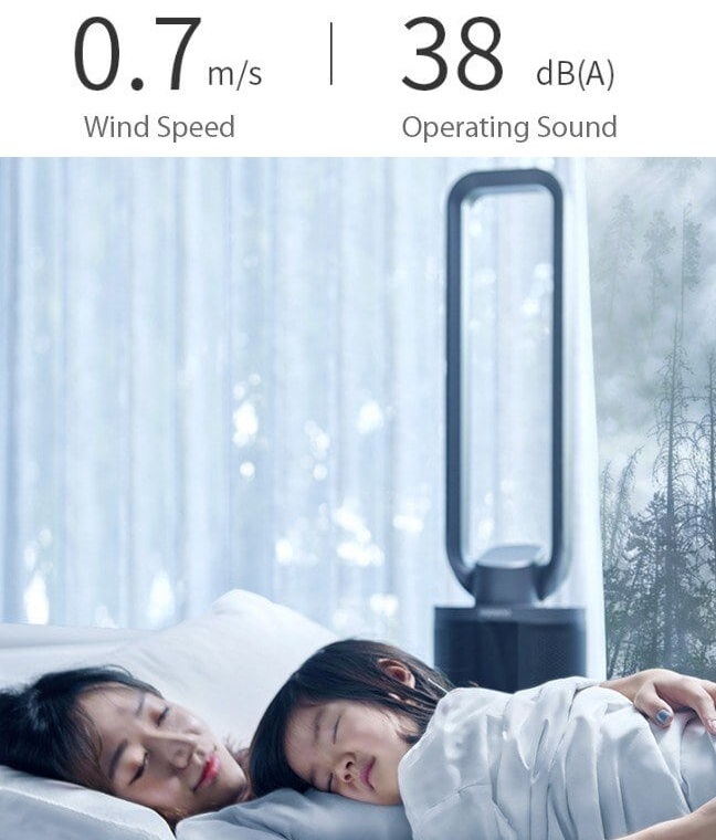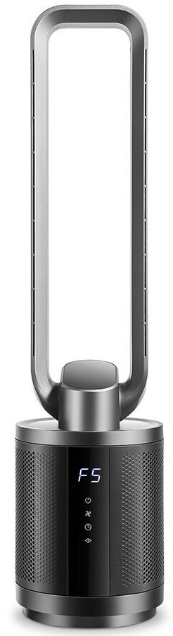 Ventilatorul dispune de unghi ajustabil, de control tactil pentru operațiune ușoară și are filtre detașabile și care pot fi spălate. Așa cum se poate vedea, aparatul dispune de un design fără lamele ceea ce înseamnă că se evită situațiile de accidentare din greșeală (ex: un copil care atinge lamelele unui ventilator clasic în funcționare).