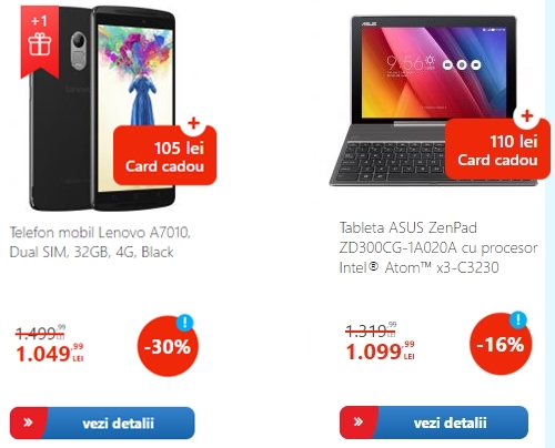 De asemenea și tableta Asus ZenPad ZD300CG-1A020A beneficiază de o reducere bine venită astăzi, model cu display IPS HD de 10.1 inch, procesor quad-core Intel Atom X3 de 1.2 GHz, 2 GB memorie RAM și 16 GB spațiu intern de stocare. Primim conectivitate 3G, WiFi, și un dock tastatură. Prețul său este acum de 1.099 lei, iar odată cu achiziția sa ni se oferă și un card cadou de 110 lei.