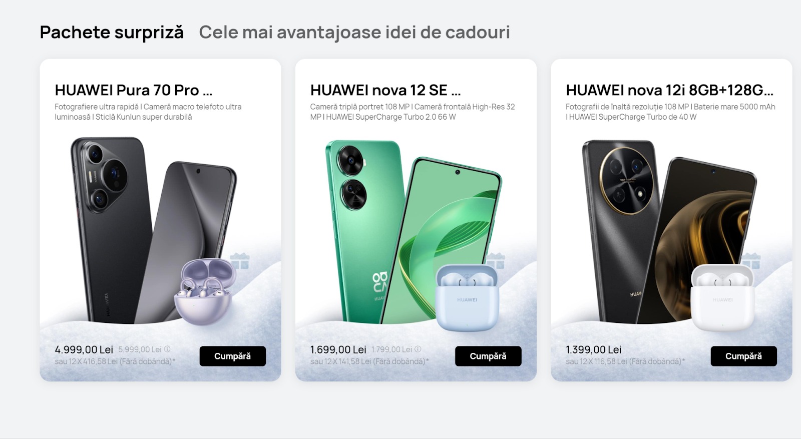 Gata cu Black Friday! Acum au început campaniile de oferte speciale de Crăciun şi găsim o sumedenie de cadouri tech care să vă inspire în HUAWEI Store. Campania de Crăciun este cunoscută sub numele de „Giving Forward", iar ofertele ţin până pe 26 decembrie. Le aflaţi mai jos.