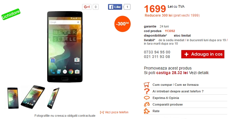 OnePlus 2 este pe cale să primească un succesor peste doar câteva zile, dar asta nu înseamnă că telefonul nu mai reprezintă o soluție potrivită de luat în calcul pentru o posibilă achiziție. Iar un element ce contribuie la această afirmație este și reducerea de preț oferită de către Cel.ro - magazin ce vinde produsul în această perioadă la un preț de 1.699 lei (preț vechi 1.999 lei).