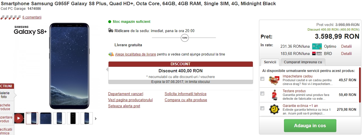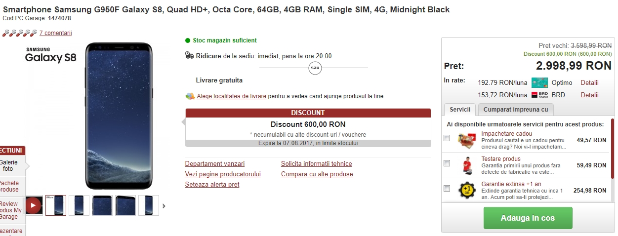 Flagship-ul Samsung Galaxy S8 primește astăzi o reducere binevenită din partea PC Garage, retailer ce vinde produsul la suma de 2.998 lei după aplicarea unui discount de 600 lei asupra prețului inițial. Și varianta phablet de 6.2 inch numită Galaxy S8+ beneficiază de o tăiere de preț, reducerea fiind aici de 400 lei și prețul cel nou de 3.589 lei. Ofertele sunt chiar atractive și cei care oricum voiau să achiziționeze unul dintre aceste telefoane vor economisi ceva bani din bugetul propus.