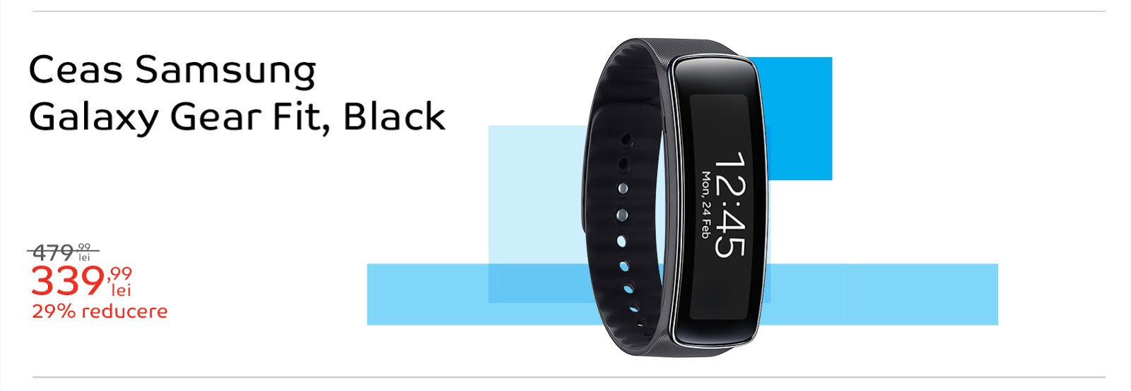 De asemenea, întâlnim în lista de produse cu prețuri scăzute, și ceasul inteligent Gear Fit, cel mai accesibil totodată din portofoliul Samsung. Ceasul în cauză vine cu display Super AMOLED de 1.84 inch, o baterie de 210 mAh, și certificare IP67 pentru rezistență la apă și praf. Primim funcții de monitorizare a pulsului, un senzor pedometru și Bluetooth 4.0. Prețul său este acum de 339 lei.