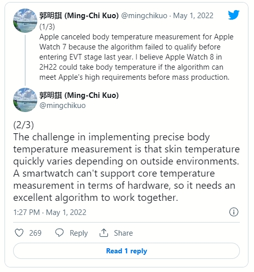 Ming-Chi Kuo spune că Apple ar fi renunțat la senzorul de temperatură în cazul seriei Apple Watch 7 întrucât algoritmul de măsurare folosit ar fi cauzat probleme. Kuo crede că aceste erori de algoritm se vor rezolva până în al doilea trimestru din acest an, iar el își va face apariția în cazul Apple Watch Series 8.