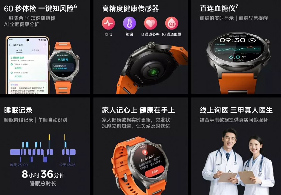 Se încarcă în doar 75 de minute de la zero la full. E şi foarte rezistent, cu certificare 5 ATM, certificare IP68 şi IP69. Şi am ajuns la cel mai interesant aspect: senzorul pentru glucoza din sânge. Poate oferi citiri în timp real şi alerte pentru orice anomalie. Poate şi monitoriza tensiunea arterială şi evalua riscul de hipertensiune. Păstrează şi funcţii ale lui X2, precum EKG, sănătate vasculară, puls, SpO2, calitatea somnului, detecţie a apneei în somn, plus temperatura.