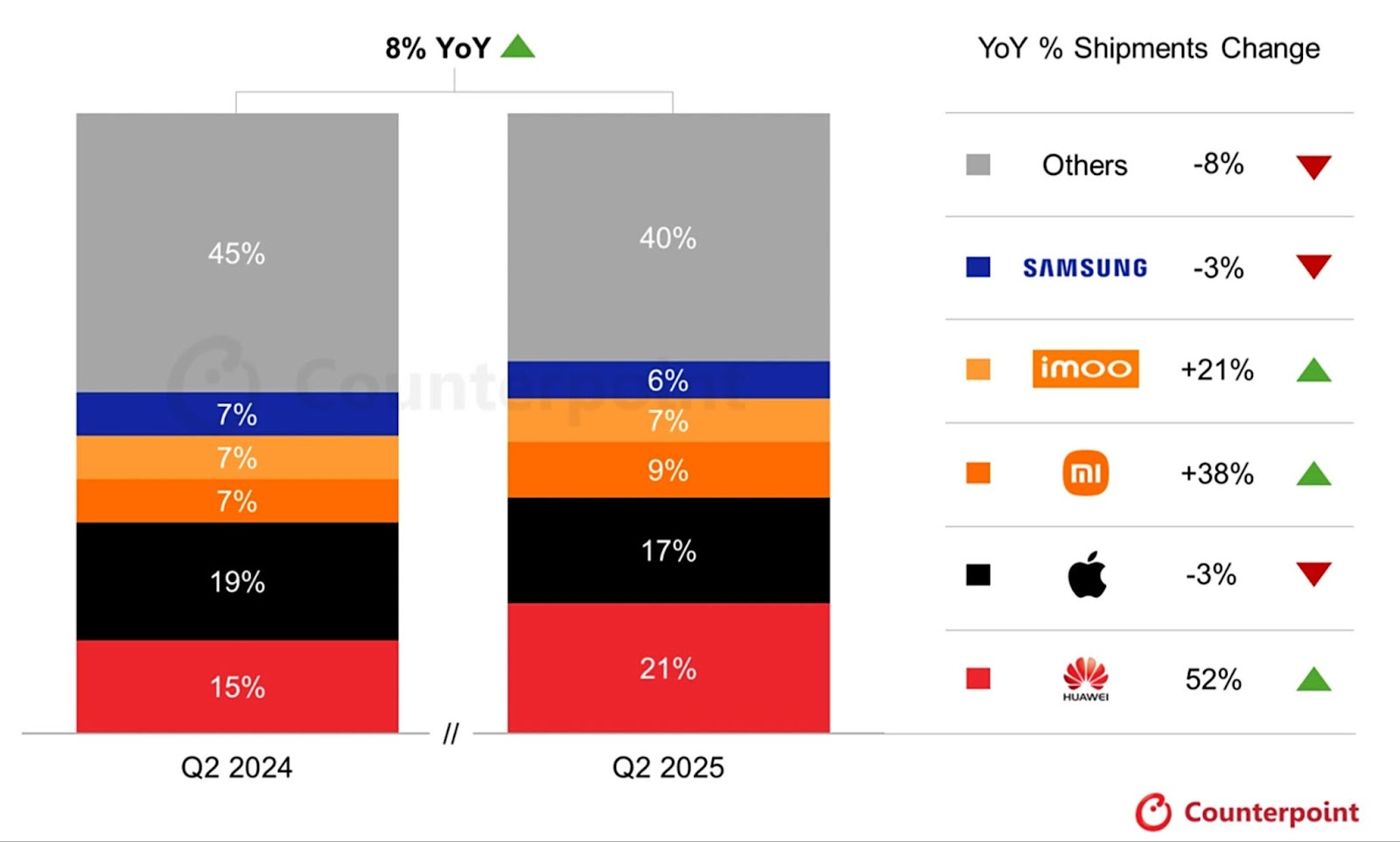 - Huawei – 21% cotă de piață (în creștere de la 15%), +52% YoY