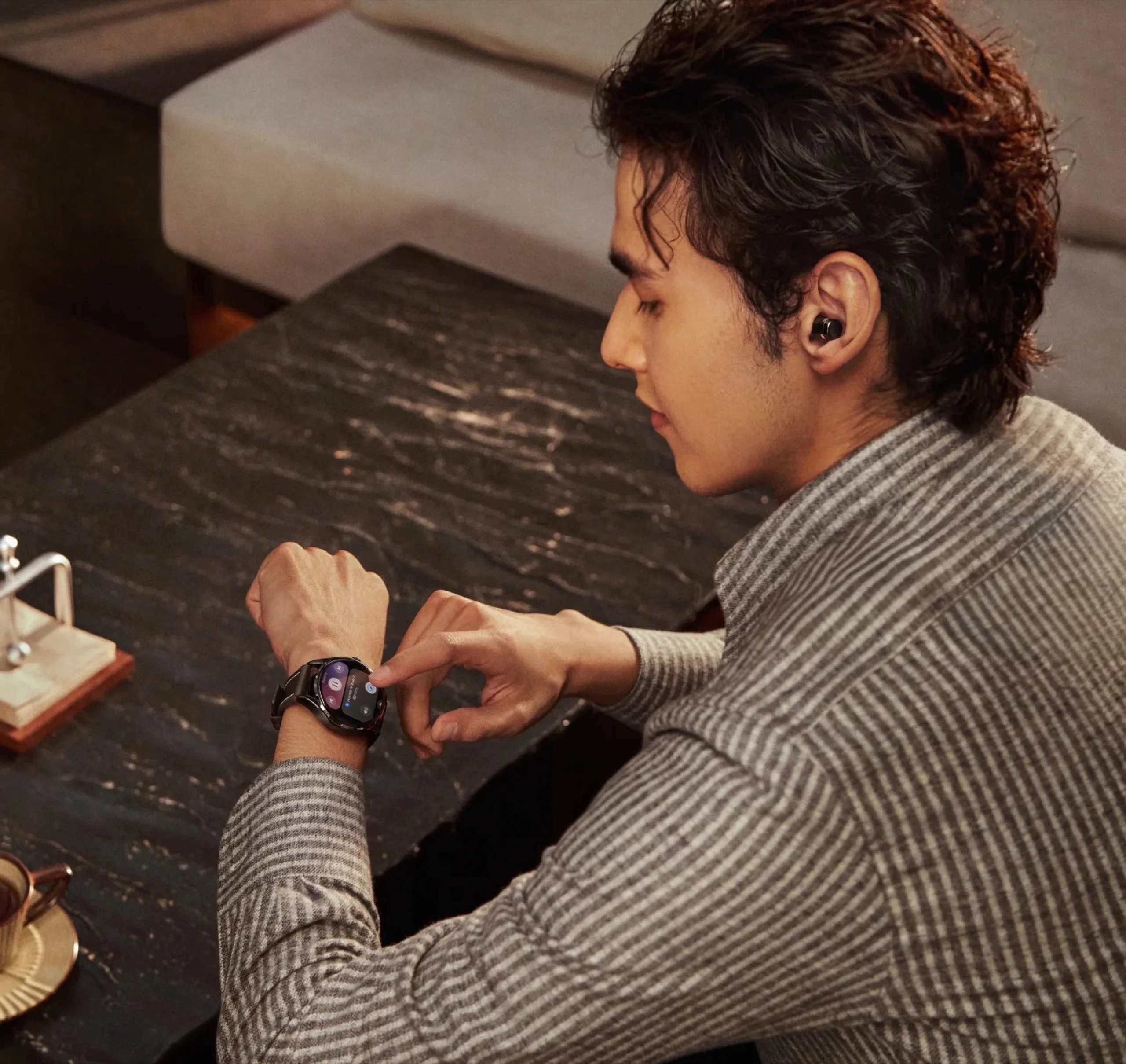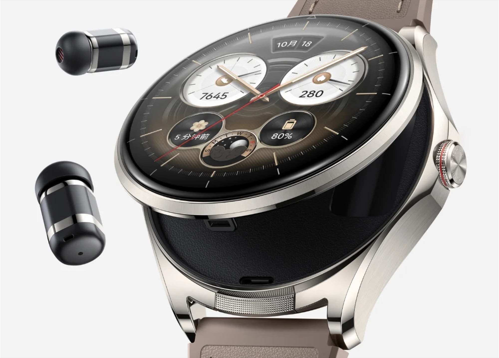 Ideea nu e nouă, dar avem parte acum de o carcasă din titan, mai rezistentă la zgârieturi. Este mai ușor decât modelul anterior, cântărind aproximativ 54.5 grame, dar și mai subțire, ceea ce face noul model mai confortabil la purtare. Interesant este mecanismul prin care ecranul se deschide: apăsarea coroanei ridică display-ul și oferă acces rapid la căștile ascunse în interior.