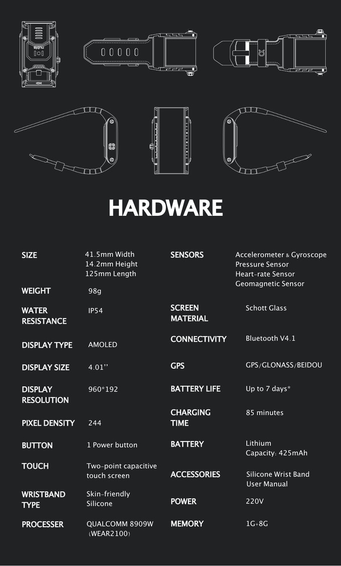 Prețul normal al lui Nubia Watch ar fi de 399 dolari și după cum puteți vedea, ceasul adoptă un ecran flexibil ce se întinde și în extremități, mult peste un smartwatch sau smartband obișnuit. Avem aici un ecran flexibil OLED cu diagonală de 4.01 inch, rezoluție de 960 x 192 pixeli și funcție Dynamic Display pentru animații și efecte personalizate.