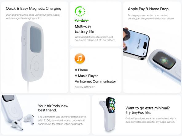 E o husă bizară pentru un produs conceput pentru a fi purtat la încheietură, dar cu siguranță poate stârni nostalgia utilizatorilor de iPod Classic din trecut. Compania promovează acest accesoriu spunând că Apple Watch-ul poate purta rol de telefon, player muzical și dispozitiv de comunicare text.