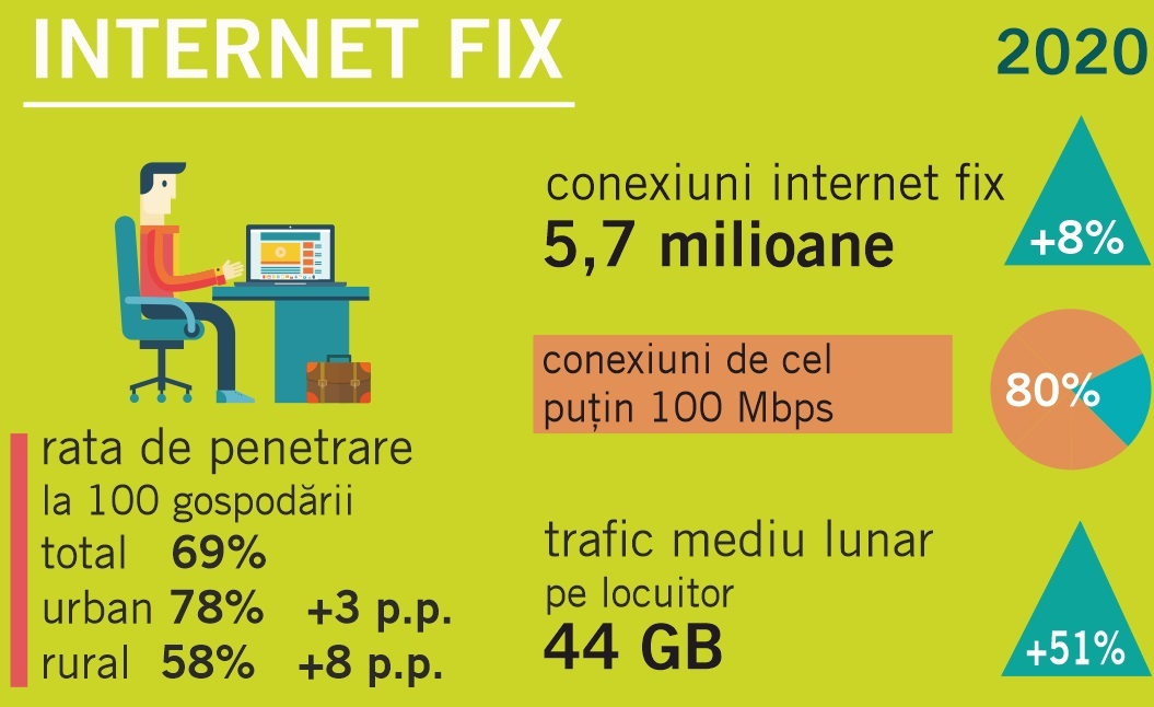 La nivelul Internetului fix existau 5.7 milioane de conexiuni la final de an 2020 (+8% evoluţie anuală), dintre care 4.5 milioane, adică aproape 80% reprezentau conexiuni de viteză foarte mare (peste 100 Mbps). Traficul mediu lunar de Internet fix per locuitor a fost de 44 GB pe lună, iar cifrele arată că la nivel naţional în medie 7 din 10 gospodării deţin o conexiune de Internet fix, mai precis 8/10 gospodării urbane şi 6/10 gospodării rurale.