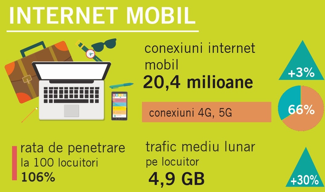 La nivel de Internet mobil existau 20.4 milioane de conexiuni active la sfârşitul lui 2020 (+3%), două treimi (13.6 milioane) fiind conexiuni 4G sau 5G (+13%). Traficul total de Internet mobil a crescut cu 30% faţă de 2019, iar traficul mediu a ajuns la 4.9 GB/lună/locuitor.