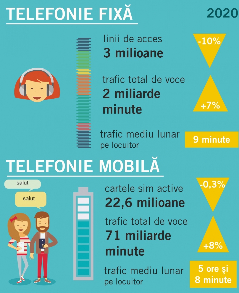 Veniturile sectorului telecom au crescut uşor, la peste 3.4 miliarde de euro (16.7 miliarde de lei), cu o pondere în PIB de 1.6%. Telefonia mobilă a generat 39% din totalul veniturilor din piaţă, în vreme ce Internetul (fix şi mobil) a generat 31%, iar segmentul de retransmisie a programelor TV a adus 14%, celelalte servicii însumând 16%, conform aceleiaşi surse. Anul 2020 a adus şi surprize: