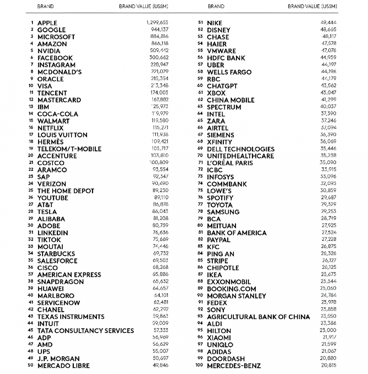 Un alt punct notabil e debutul ChatGPT pe locul 60, cu o valoare de 43,6 miliarde USD – cea mai bine clasată nouă intrare din topul 100. Este o performanță remarcabilă pentru un brand cu o existență publică de doar câțiva ani, depășind așteptările din zona AI.