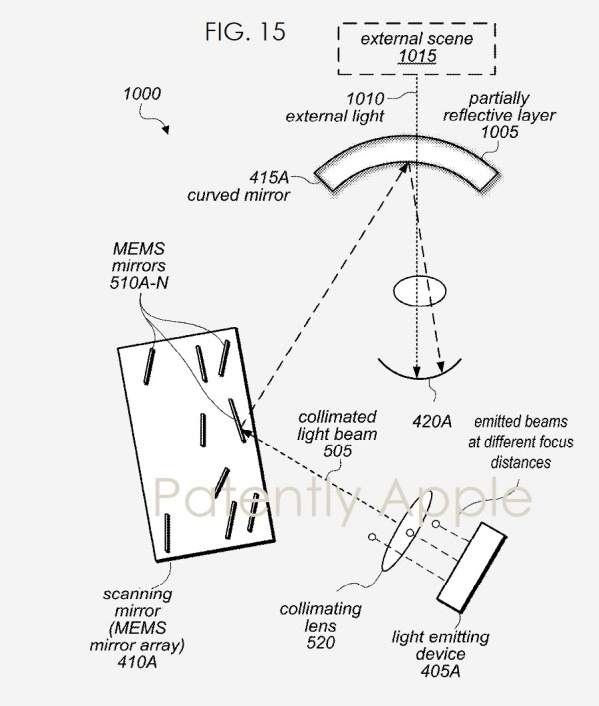 Dispozitivul menţionat în document direcţionează un sistem de proiecţie pe retină, folosind focalizare dinamică pentru un display montat în faţa ochilor utilizatorului. O experienţă poate fi livrată în VR sau AR. Documentele menţionează un mecanism care oferă focalizare dinamică în realitate virtuală sau augmentată.