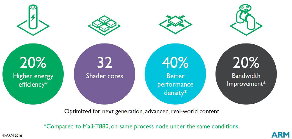 Noul chip are o latență de 4ms, detaliu ce ne indică din start că nu vom avea motive de îngrijorare cu privire la fenomenul de lag în cadrul sesiunilor de gameplay. Datorită prezenței unui număr de 32 nuclee la bord (dublu față de Mali-T880), acest procesor grafic promite afișarea unor imagini mult mai clare și precise.