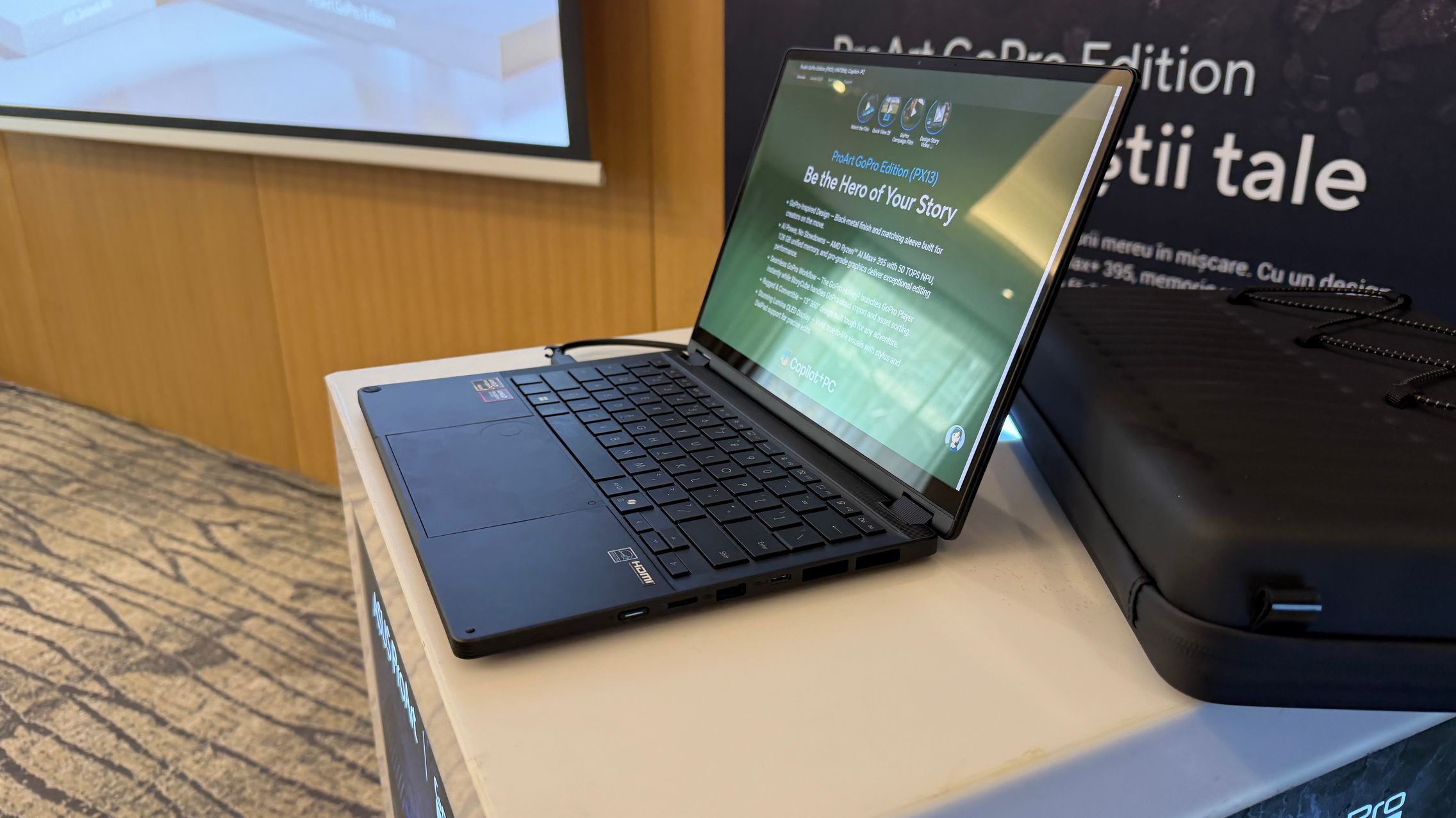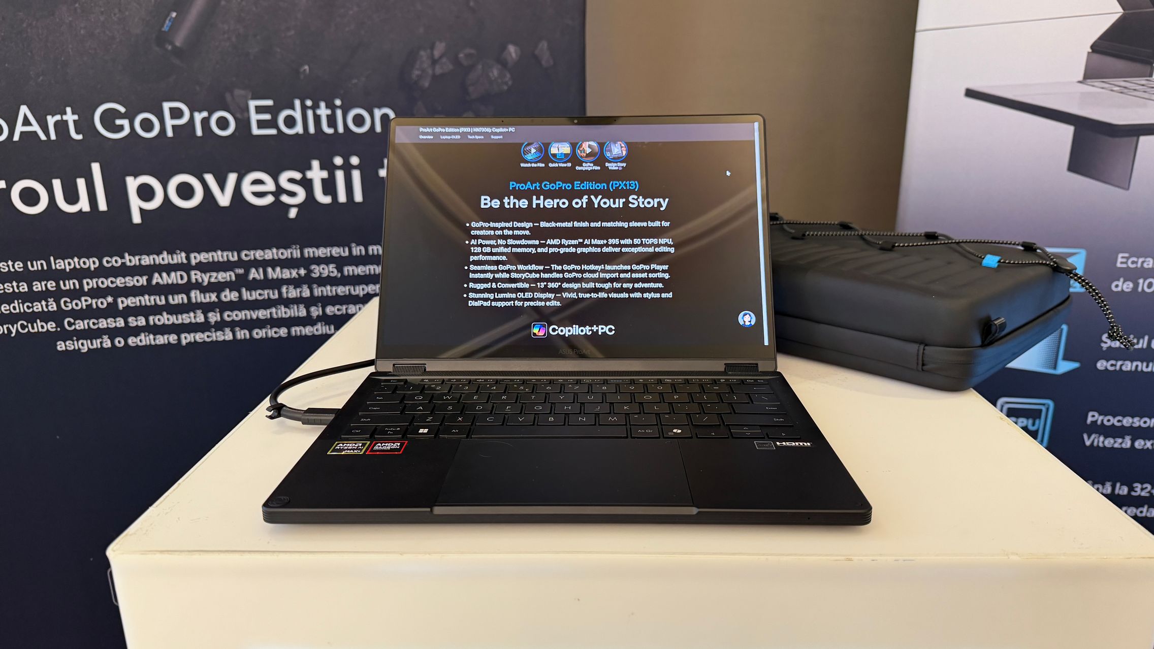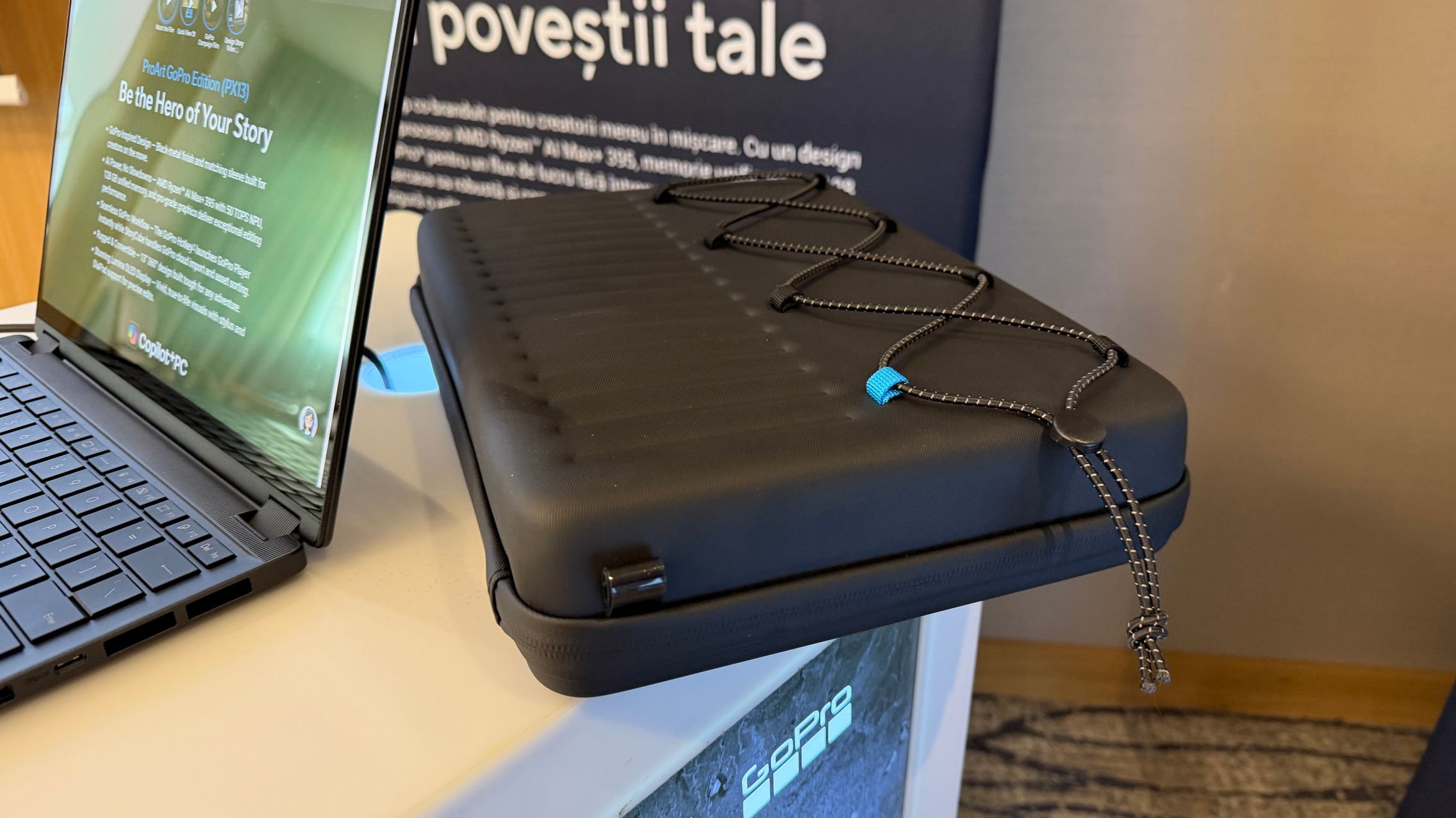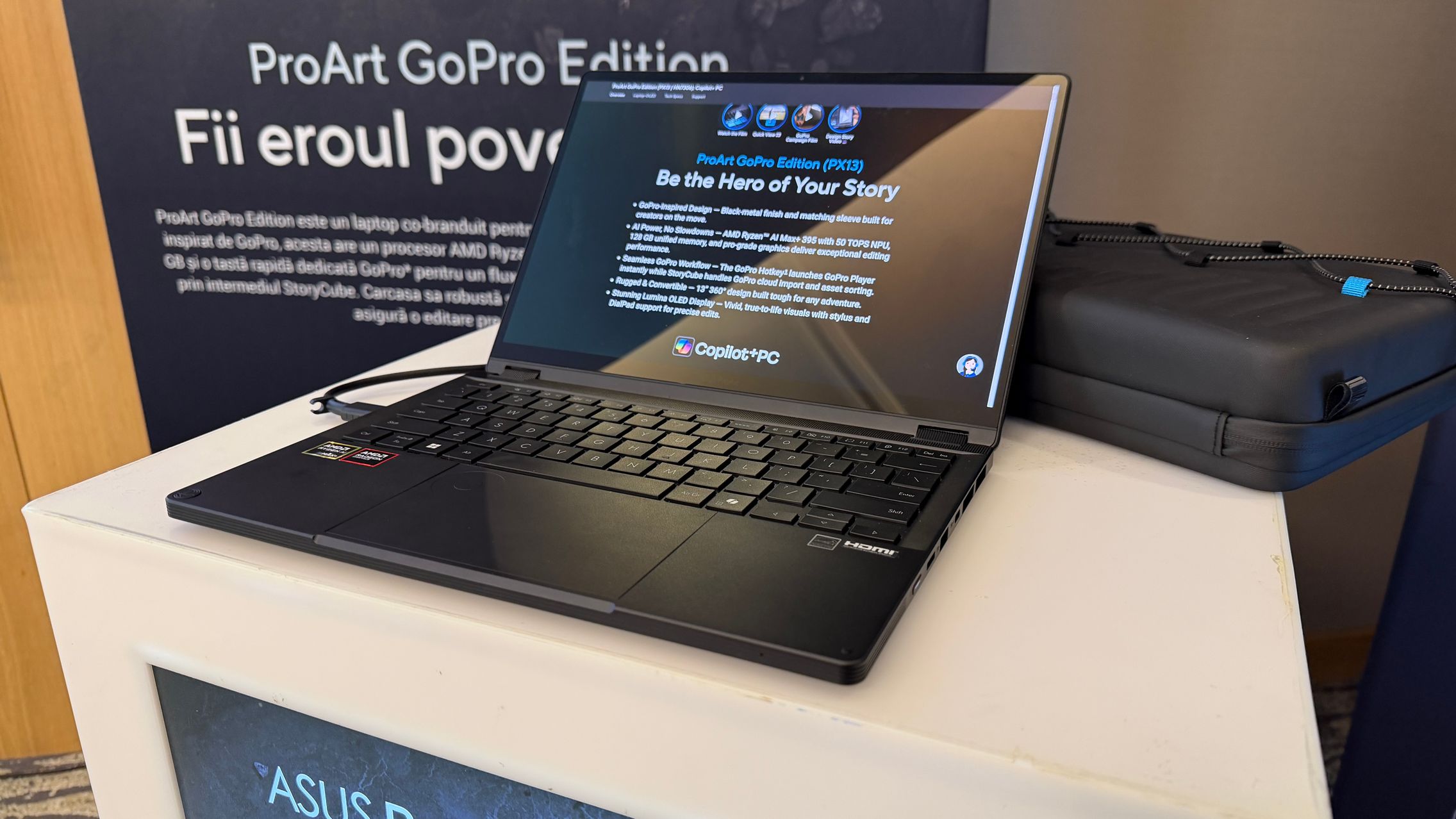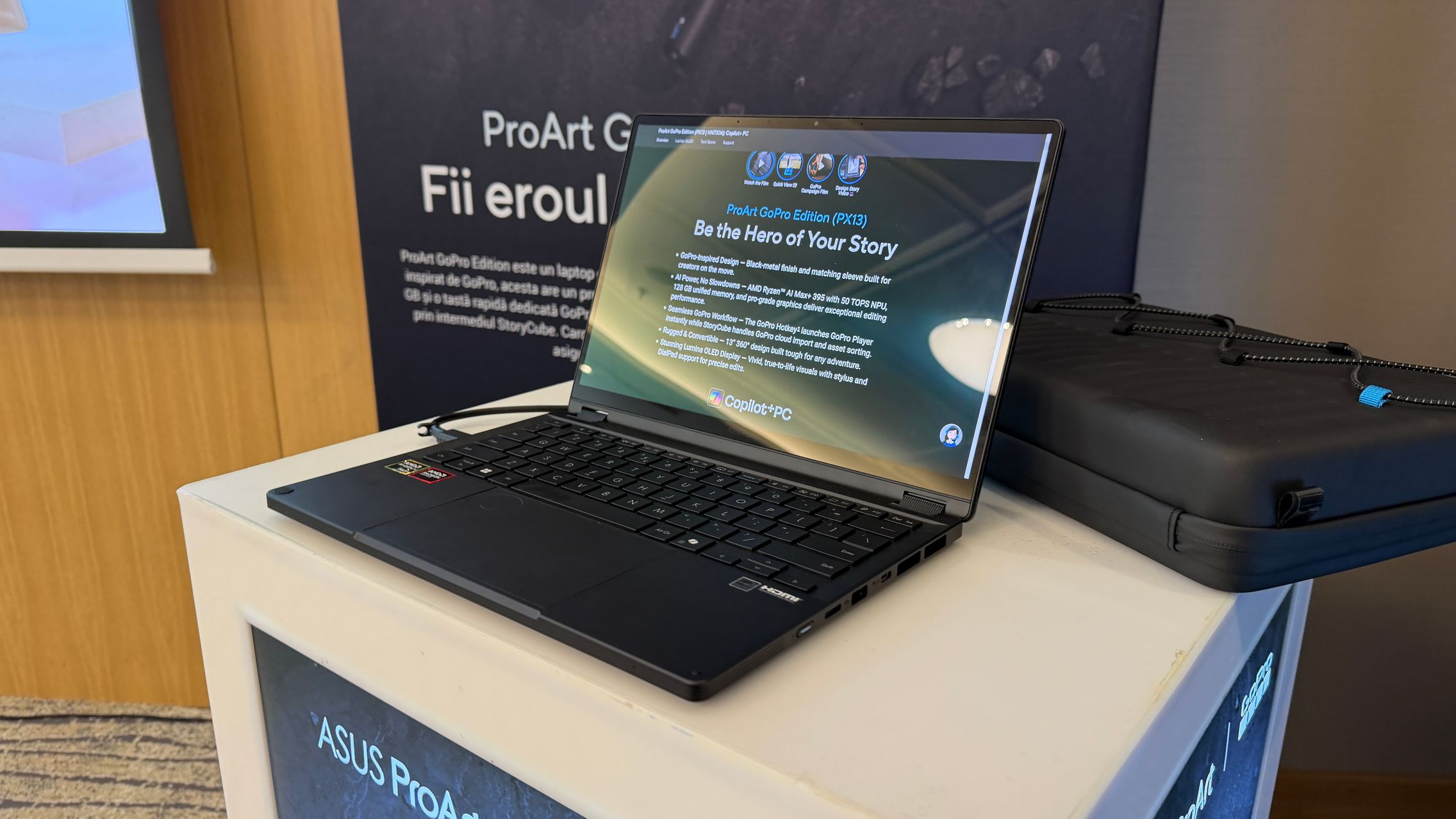 Așadar, ProArt GoPro Edition (PX13), un laptop care s-a născut din colaborarea ASUS - GoPro. Este un model rugged/robust disponibil în ediție limitată și se remarcă prin finisajul exclusiv Black Metal. Sunt și accesorii tematice, pentru huse, rucsacuri, iar dacă te decizi să îl cumperi îl vei primi într-o cutie premium tip colecție în care poți depozita camerele și accesoriile GoPro.