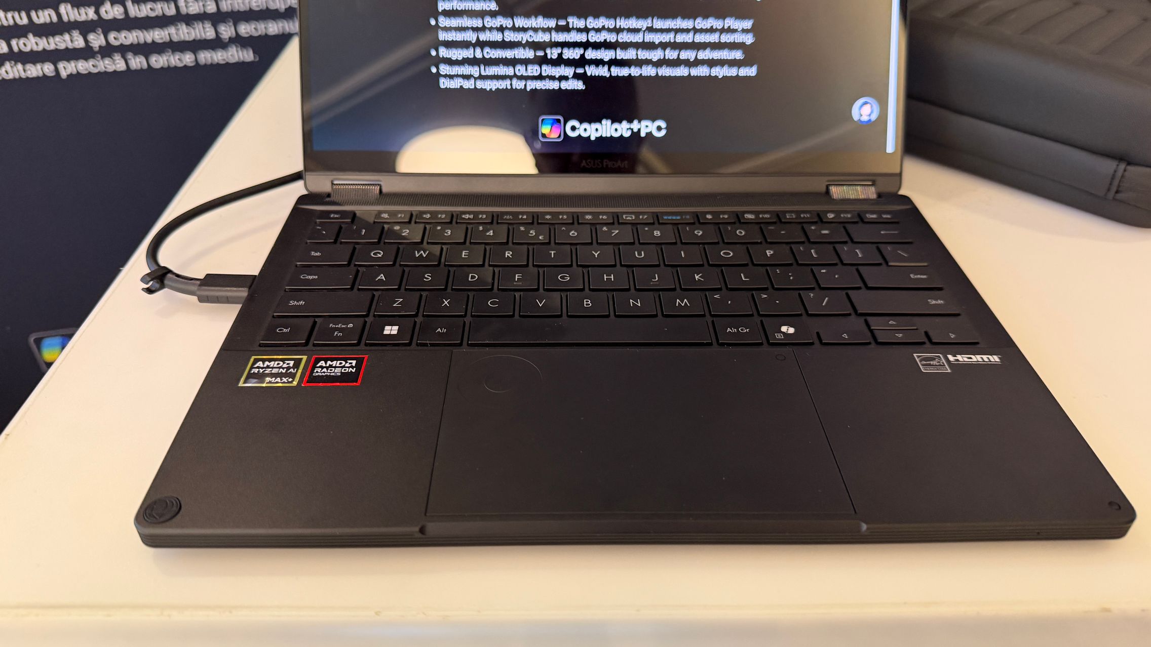 Ca echipări, laptop-ul sosește cu procesor AMD Ryzen AI Max+ 395, cu NPU de 50 TOPS, 128 GB memorie unificată și ecran OLED ASUS Lumina de 13,3 inch, cu rezoluție 3K și suport pentru stylus. Avem și un DialPad integrat în touchpad. Laptop-ul Proart are grosime de 15,8 mm, greutate de 1,39 kg, o balama rabatabilă la 360 grade și dispune de certificare militară MIL-STD-810H, astfel că poate fi utilizat și la exterior fără probleme.