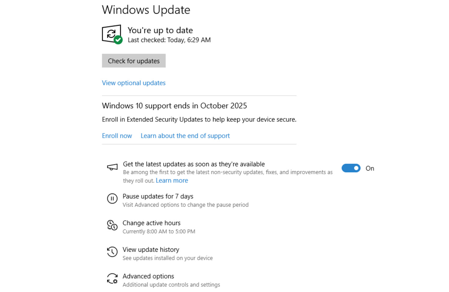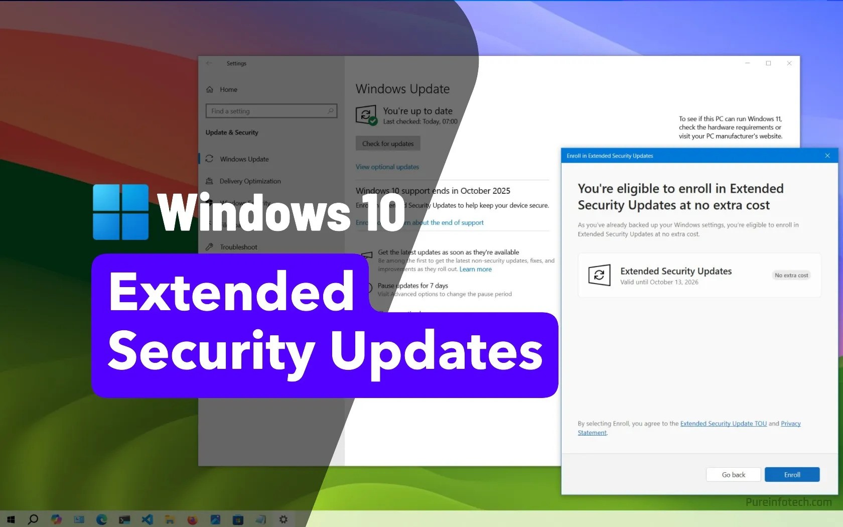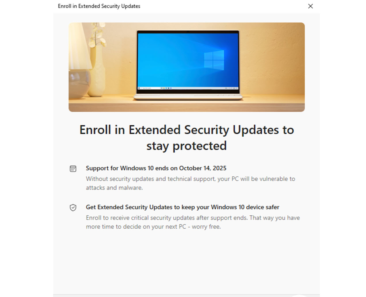 - Înscrieţi-vă la ESU alegând Update & Security din meniul Settings. Apăsaţi pe "Enroll Now". Dacă nu apare Enroll Now, atunci aveţi nevoie să instalaţi cel mai nou Windows 10 sau să reinstalaţi Windows 10.