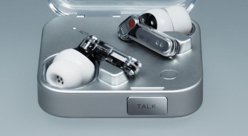 Imaginea vine chiar de la Nothing și în primul rând observ carcasa transparentă, sau mai bine zis capacul acesteia. La interior se odihnesc cele două căști in-ear cu dopuri din silicon (semn că vom avea ANC capabil), iar tot aici mai apare un buton, probabil cel de pairing.