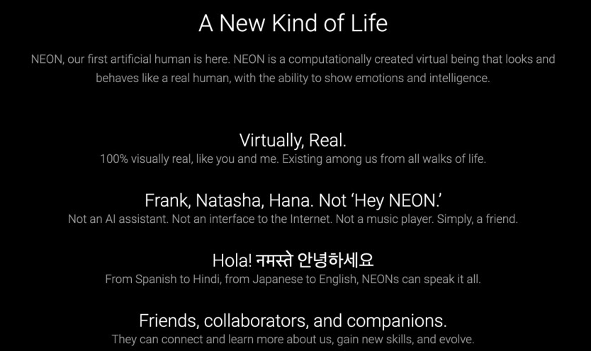 Practic avem de-a face cu avataruri hiper realiste, create de computere inteligente. În ciuda faptului că a avut loc o prezentare, totul rămâne destul de vag. NEON vine de la un startup deținut de Samsung, care a primit o finanţare serioasă. Este o "fiinţă virtuală" generată de un computer, care arată şi se poartă ca un om real. Îşi poate arăta emoţiile şi inteligența. Proiectul este creat de către STAR Labs, o filială Samsung specializată pe proiecte futuriste.