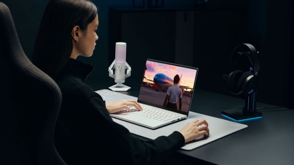 Conectivitatea implică Wi-Fi 7, Bluetooth 6.0 (sau 5.4 pe varianta AMD), Thunderbolt 4 pentru modelele Intel sau USB4 pentru cele AMD, două porturi USB-C cu DP și Power Delivery 100W, HDMI 2.1 full-size, slot de card SD sau microSD (în funcție de model), dar și jack audio. Un detaliu de efect e noul sistem de iluminare „Slash Lighting” de pe capac, cu 35 de zone RGB care pot afișa inclusiv nivelul bateriei, și, la nevoie, pot fi complet dezactivate pentru un look profesional.
