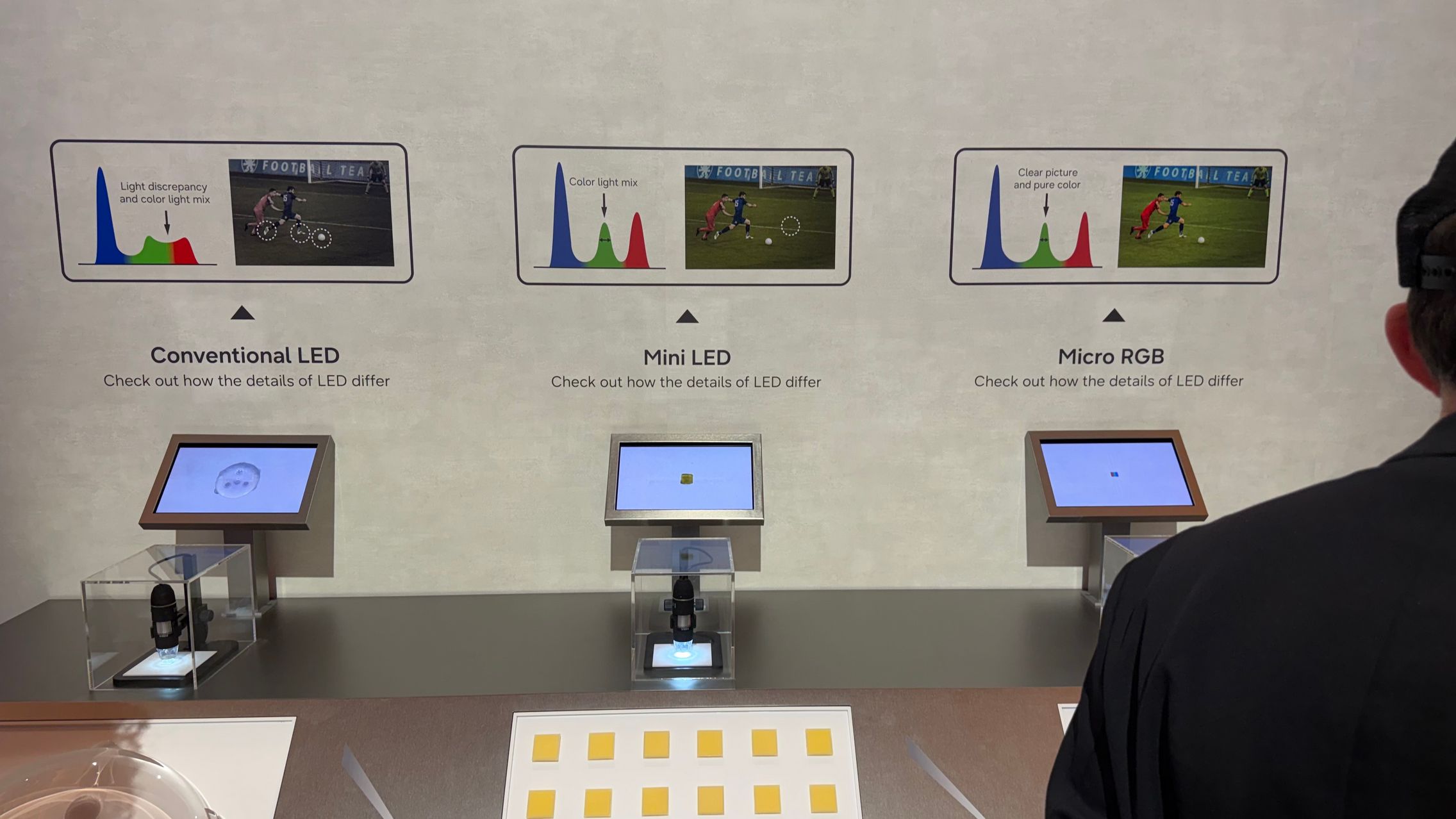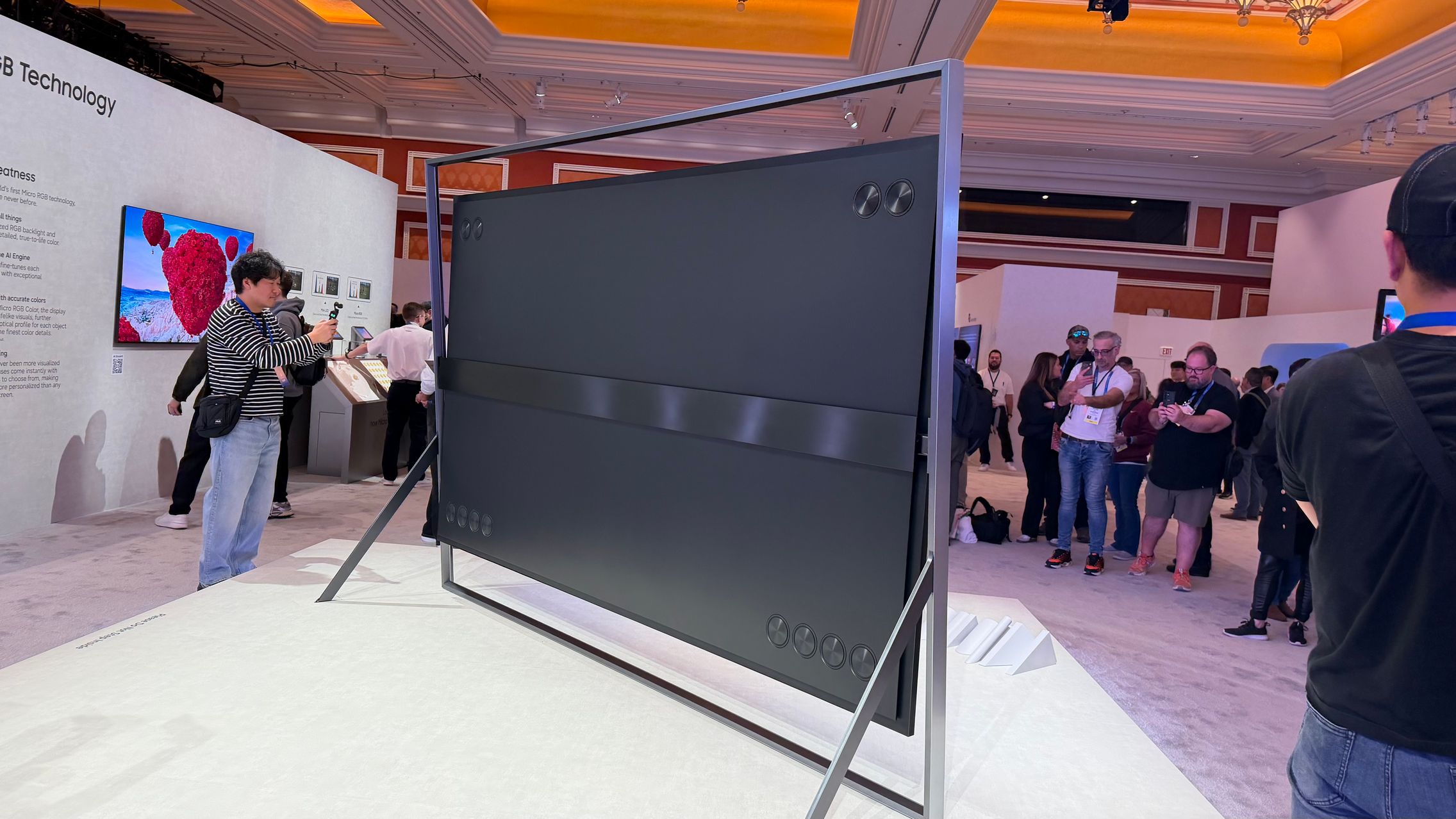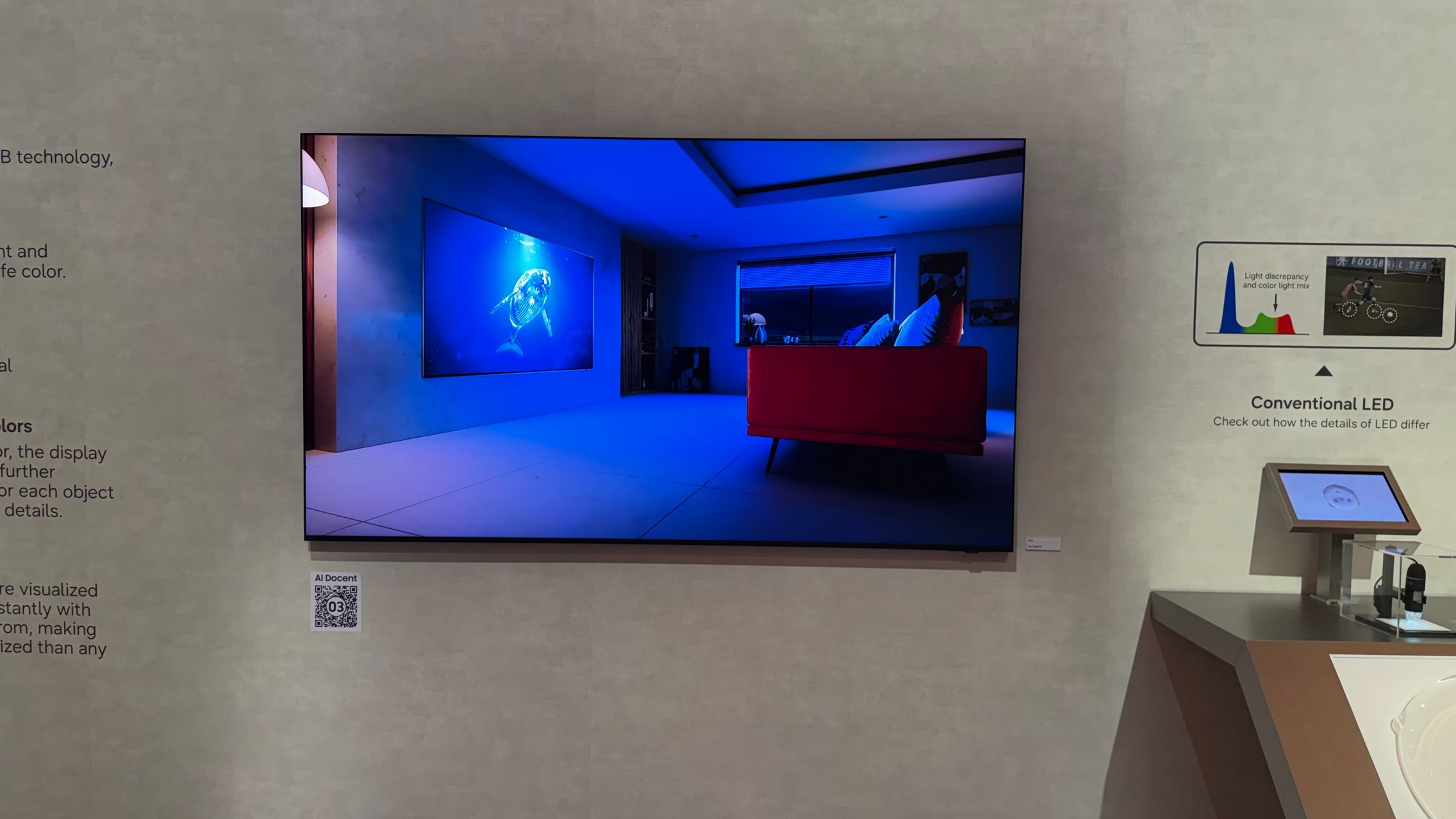 Acesta este primul model micro RGB TV care ajunge la aşa o diagonală şi e cunoscut drept R95H. Are o ramă Timeless Frame şi Spatial Audio, printre altele. Este exponentul noilor tehnologii Samsung, ca Vision AI Companion, care îţi oferă detalii despre actorii din filme sau chiar despre film şi răspunde la orice întrebări despre conţinut.